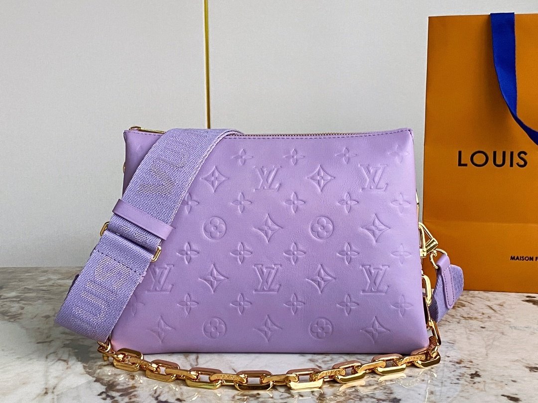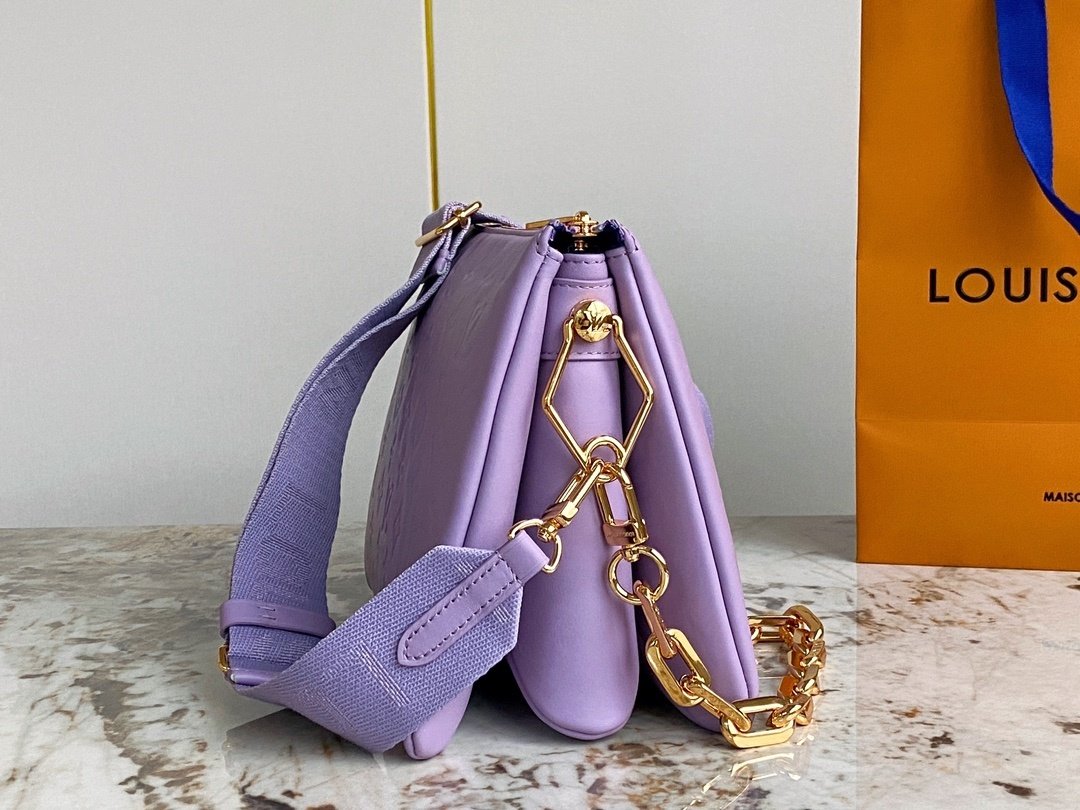 This stylish lavender crossbody bag features a beautifully embossed pattern that adds texture and sophistication to its modern silhouette. The bag includes two interchangeable straps: a wide, adjustable fabric strap for casual comfort and a chunky gold chain strap for a more elevated, chic look. The soft pastel color pairs elegantly with the gold-tone hardware, making it a standout accessory for both daytime outings and evening events. Perfect for carrying your essentials, this bag brings together fashion, function, and luxury-inspired detailing