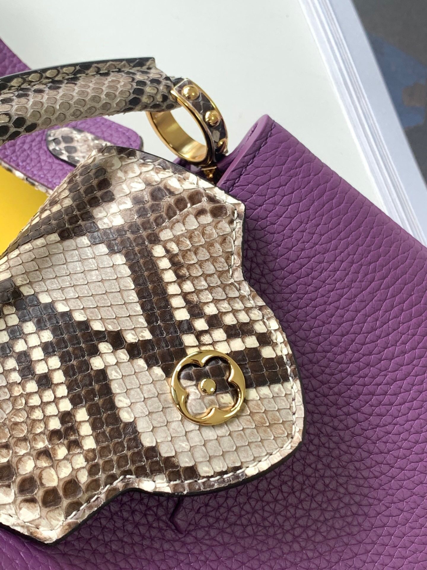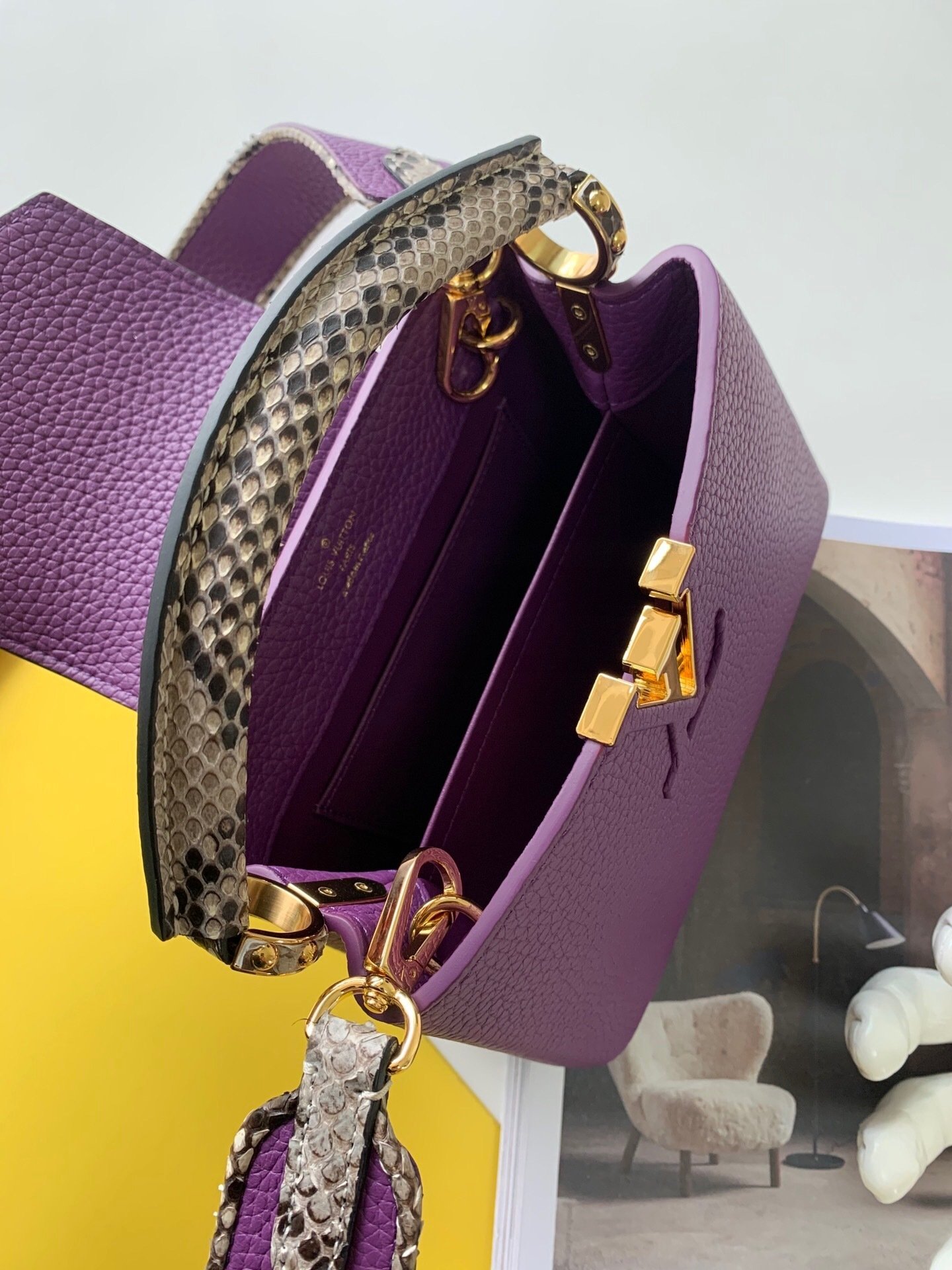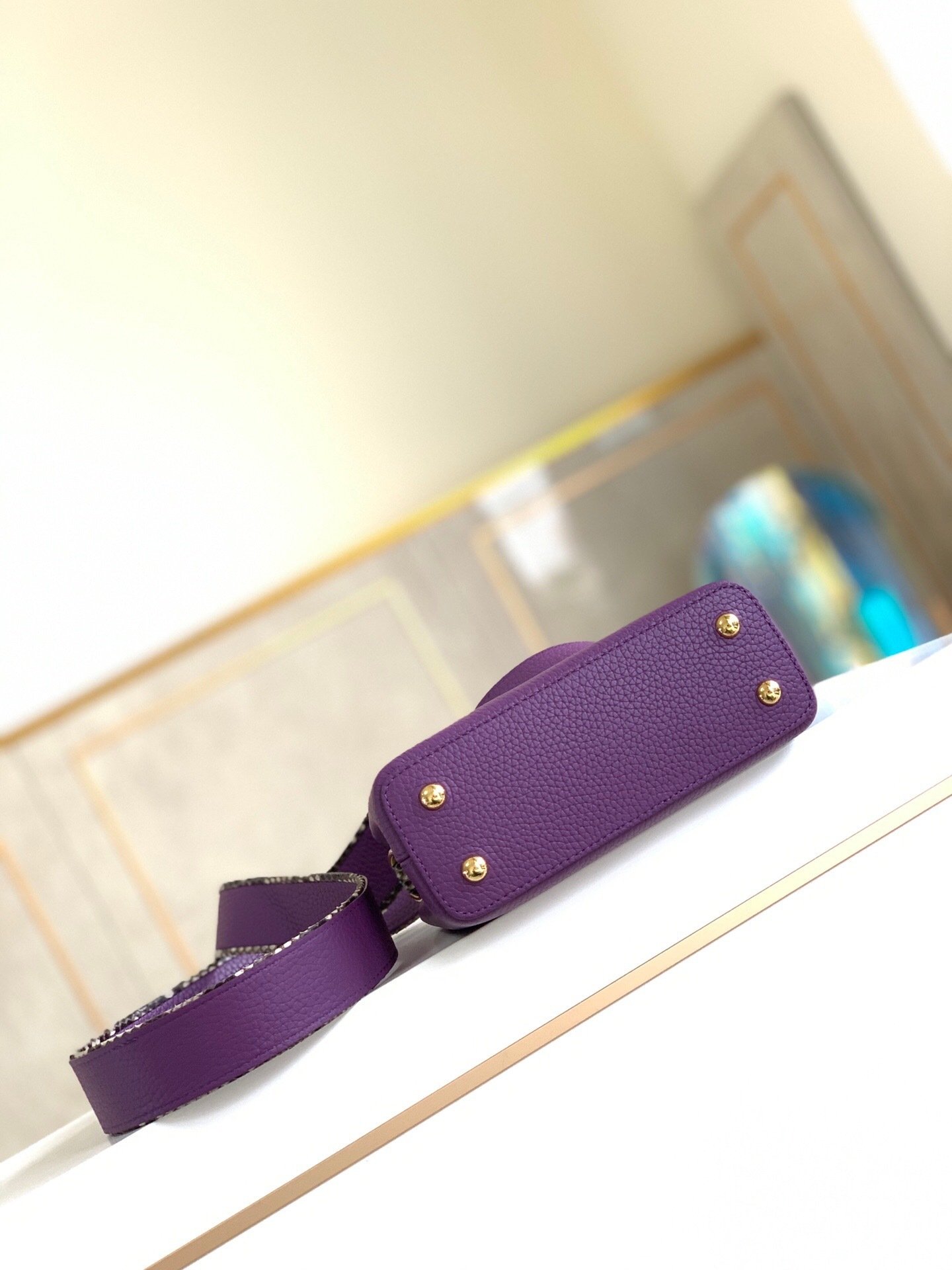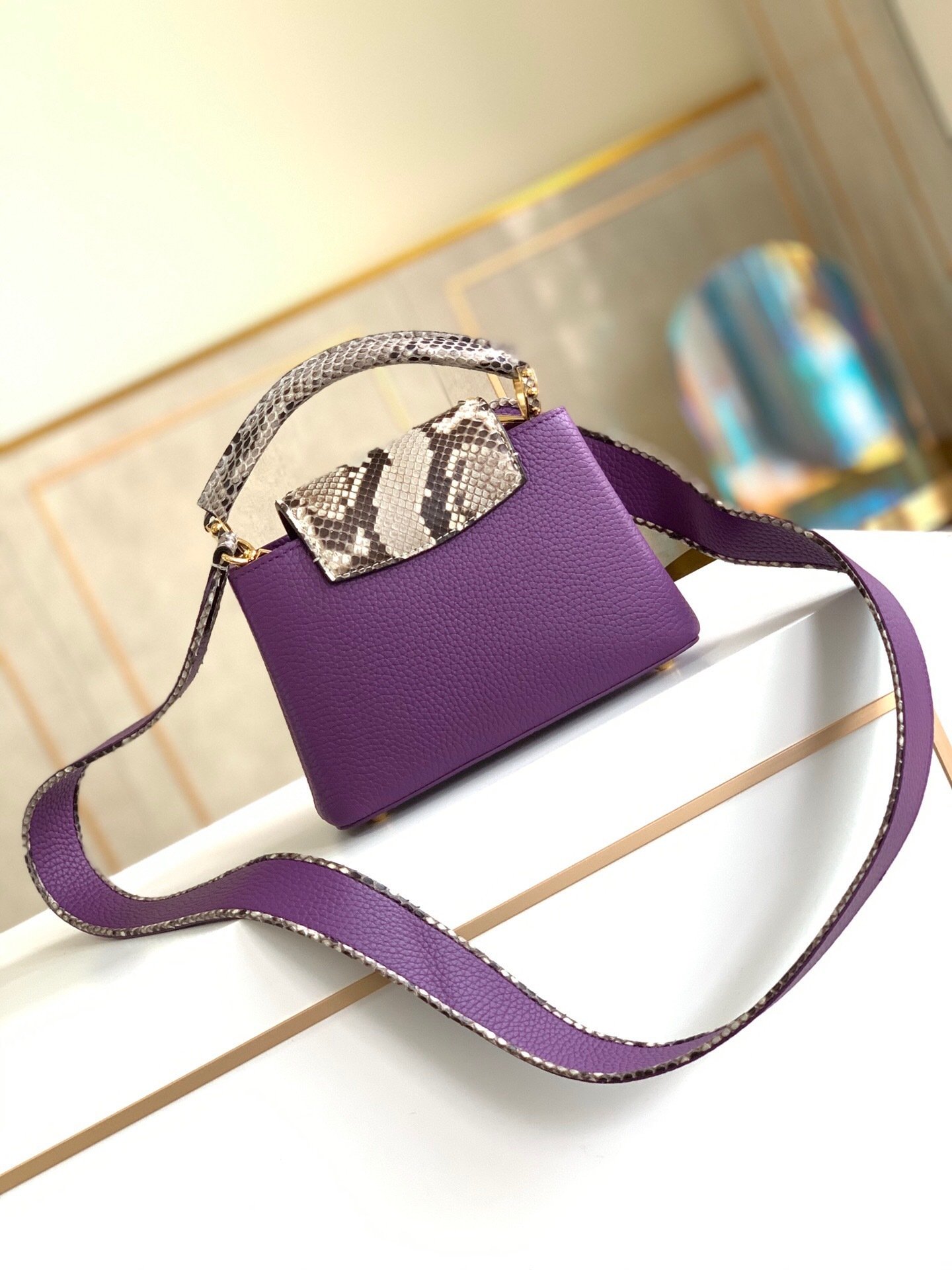 Elevate your daily style with this luxurious purple mini handbag, crafted for modern women who love elegance with a bold touch. The bag features a textured snake-pattern top handle that adds character and high-fashion appeal, while the spacious interior keeps your essentials organized throughout the day. Its smooth finish, fine stitching, and premium gold-tone hardware create a timeless look that suits both casual and formal outfits.